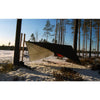 With webbing reinforcement and conveniently placed loops, the canopy can be used in a number of ways to provide both comfort and shelter. Examples of which include the use of trees, rocks, hollows, trekking poles, paddles, bikes or tarp poles. A shelter made from this tarp (weight 1.1kg) provides much more space than a tent of similar weight and can comfortably sleep up to 4 people. In extremely bad weather it can be quickly and easily put to use. It fully insulates both from the ground and from every other side. Thermal conductivity of tarp is almost 40 times lower than sand and almost 20 times lower than grass. It offers you full protection from the cold, wet weather and wind while still providing you with enough room in which to sit or lie down.